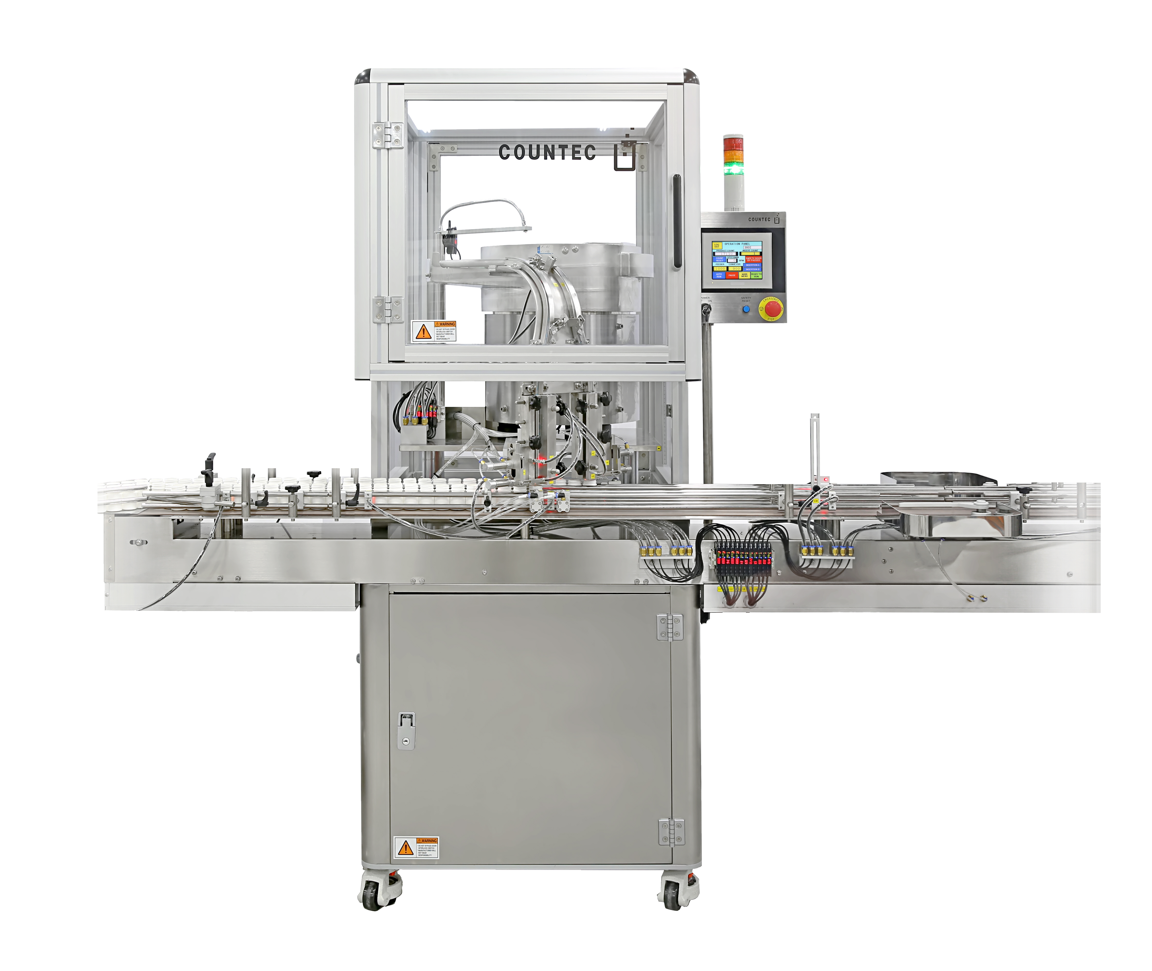 Inseridor automático de dessecante e/ou algodão para frascos farmacêuticos. Alta velocidade e precisão para linhas de produção COUNTEC.