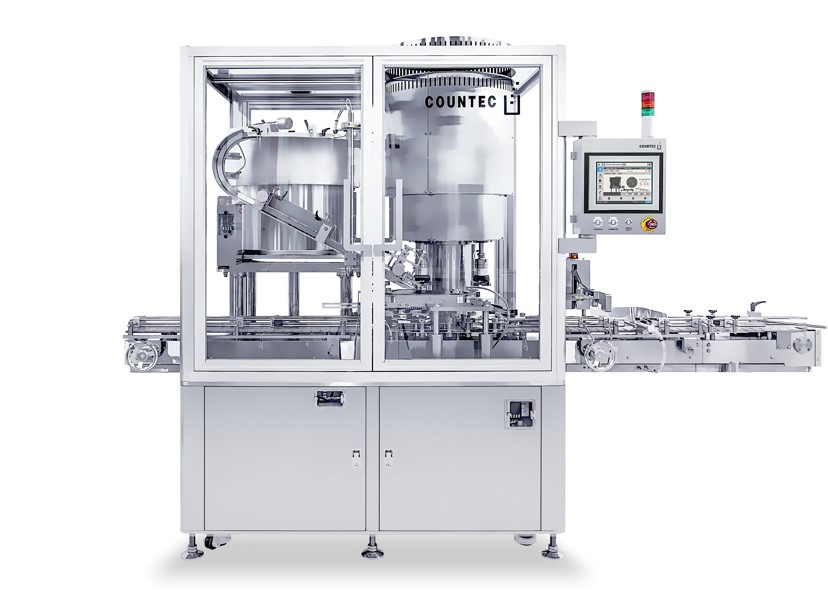 Rosqueadora automática de alta velocidade para fechamento de frascos farmacêuticos. Equipamento COUNTEC com ajuste rápido para diferentes tipos de tampo.